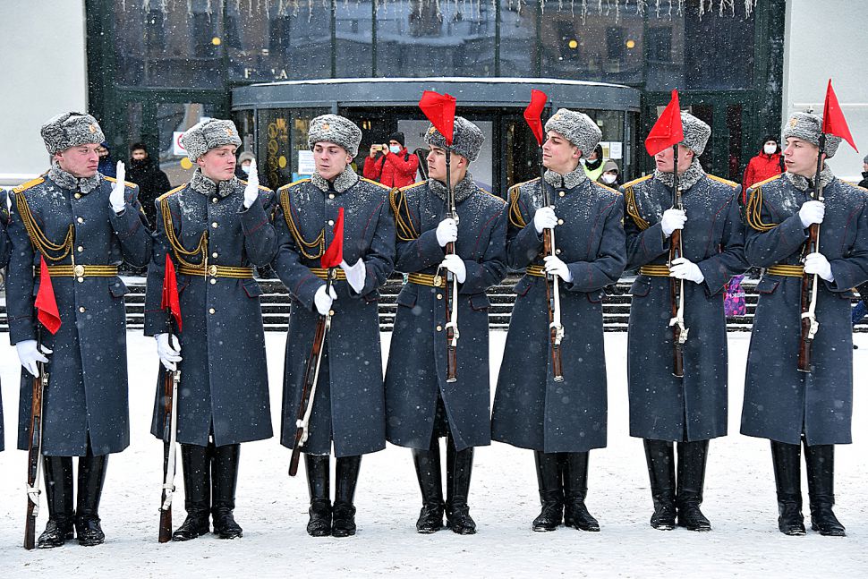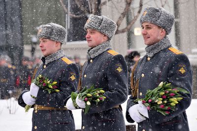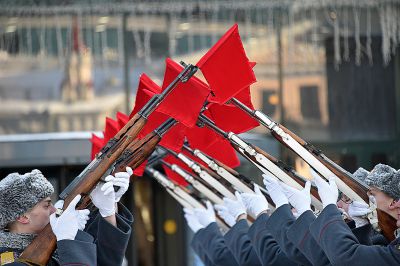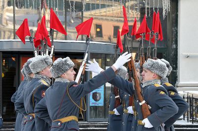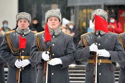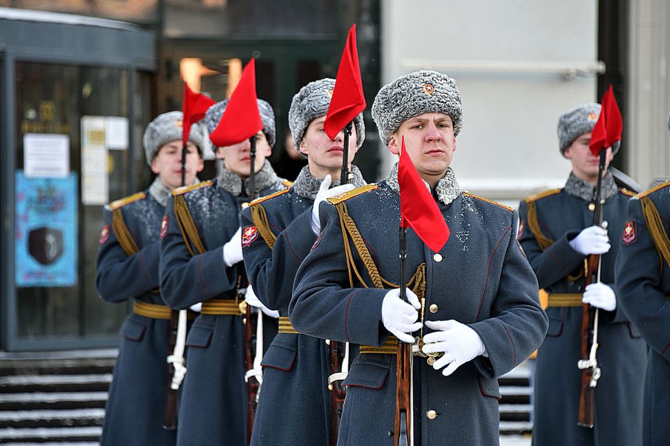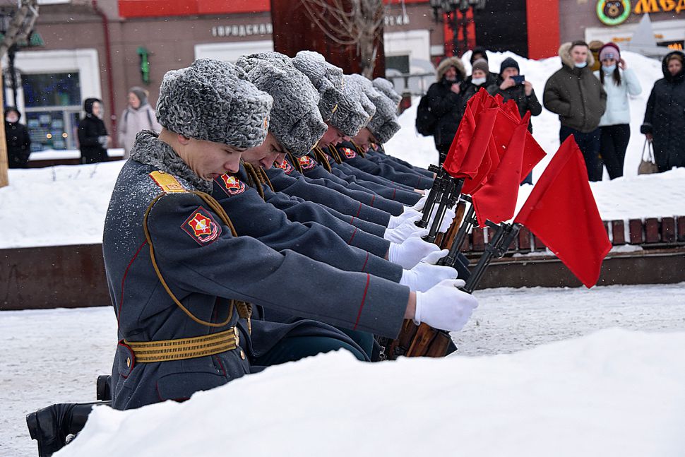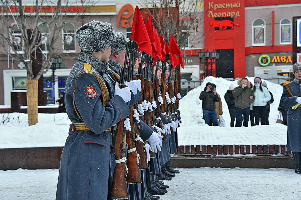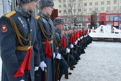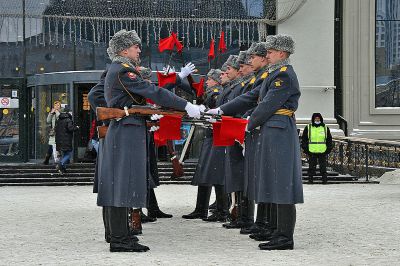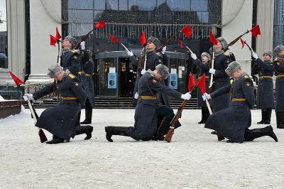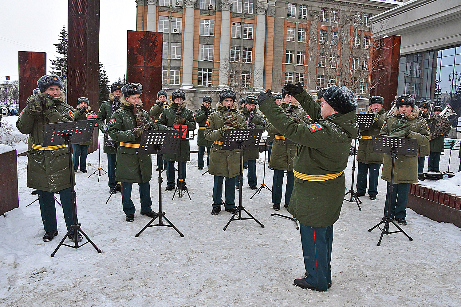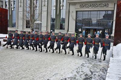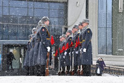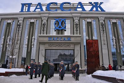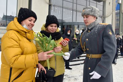 Перед входом в торговый центр «Пассаж» прошла акция «Весенний букет», организованная военнослужащими Центрального военного округа с участием роты почетного караула и оркестра ЦВО.
