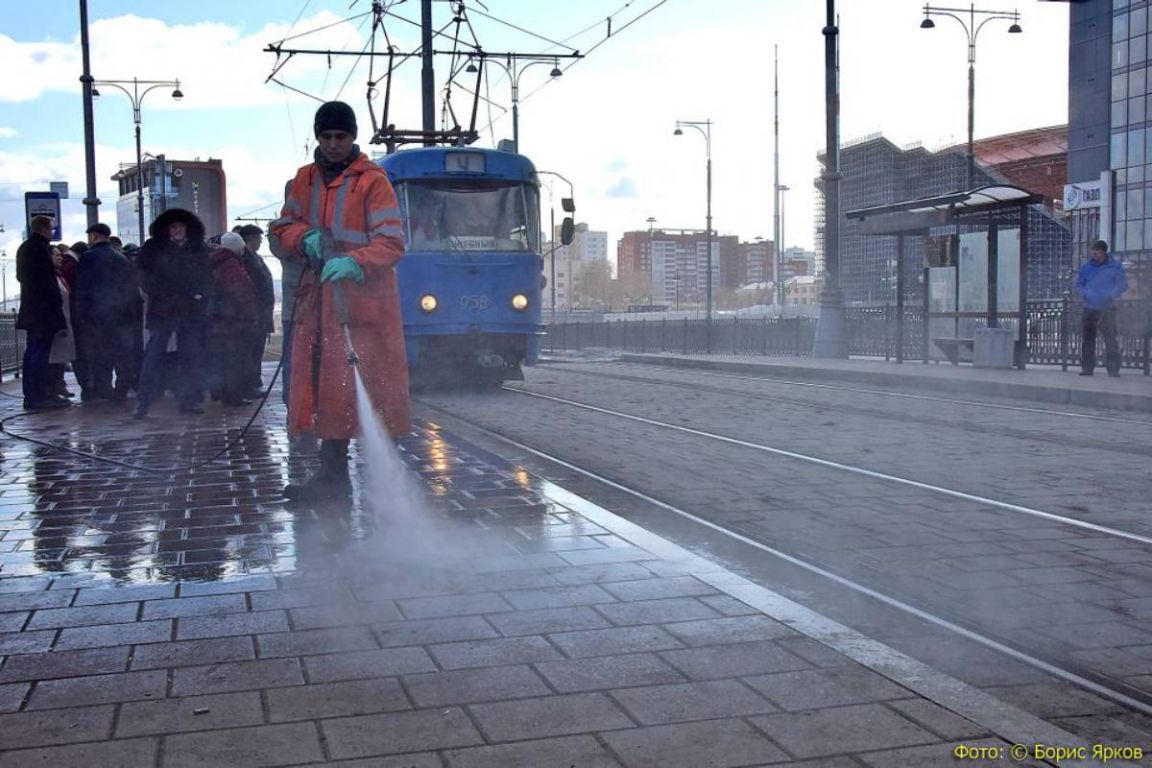 В Екатеринбурге начали отмывать остановки от зимней грязи