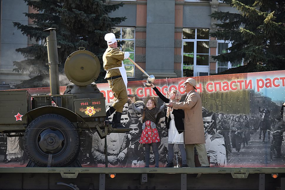 Новинкой праздничного мероприятия стало участие 11 всадников в форме казачьих кавалерийских формирований времен Великой Отечественной войны. В руках они держали знамёна частей, сформированных на Урале в годы войны.
