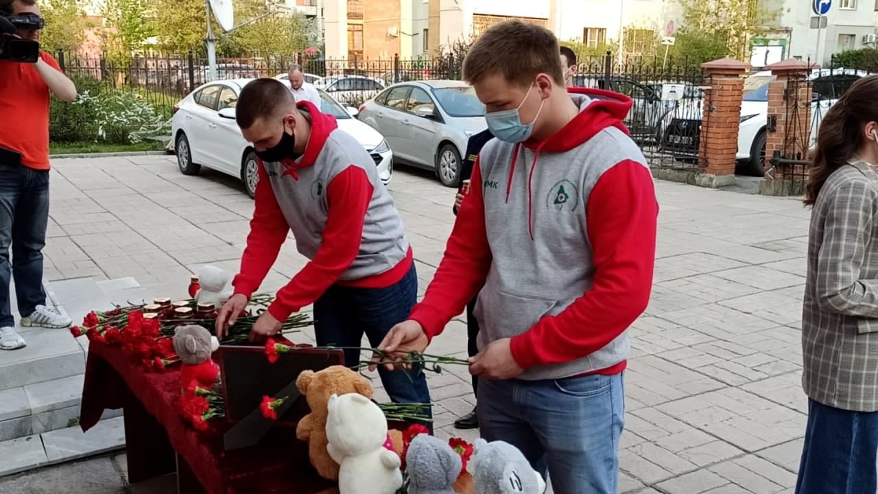 Как Екатеринбург переживает трагедию в Казани, можно увидеть по количеству цветов, свечей и мягких игрушек, которые уже второй день жители несут к символическому мемориалу.