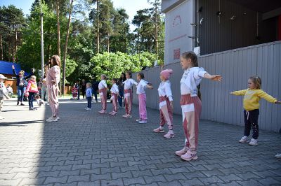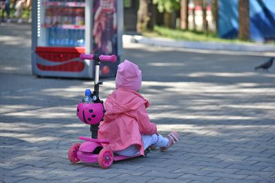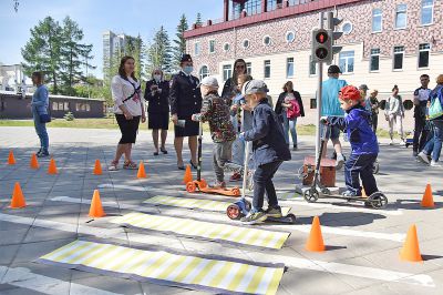 Здесь дети повторяли правила поведения на дороге, учились переходить дорогу по пешеходному переходу, ездить на самокатах по правилам дорожного движения. А один юный автолюбителей приехал в парк на старой гаишной машине.