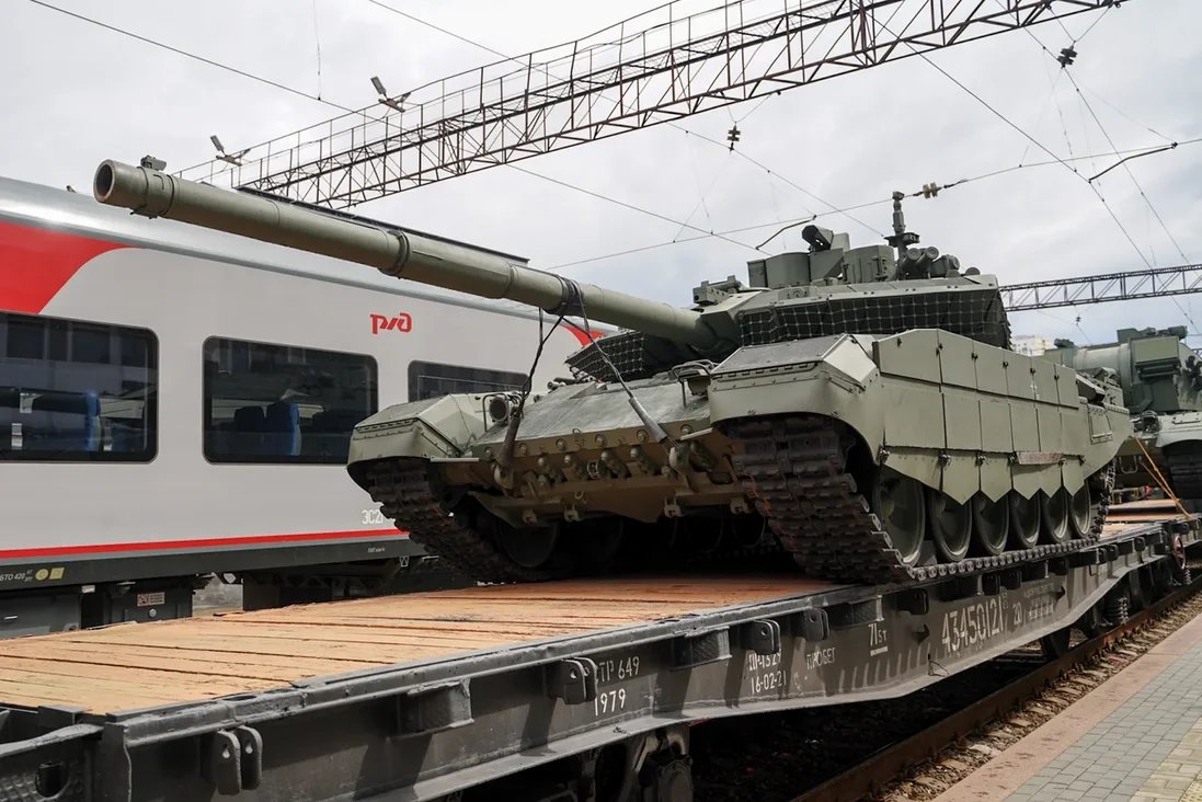 В составе воинского эшелона 17 вагонов. На платформах представлены современные образцы техники и вооружения: бронеавтомобили «Тайфун-К», танк Т-90М, самоходная артиллерийская установка «Коалиция-СВ» и другие, а также военные трофеи, привезенные из Сирии – бронеавтомобили «Хаммер-1» и «Пантера».