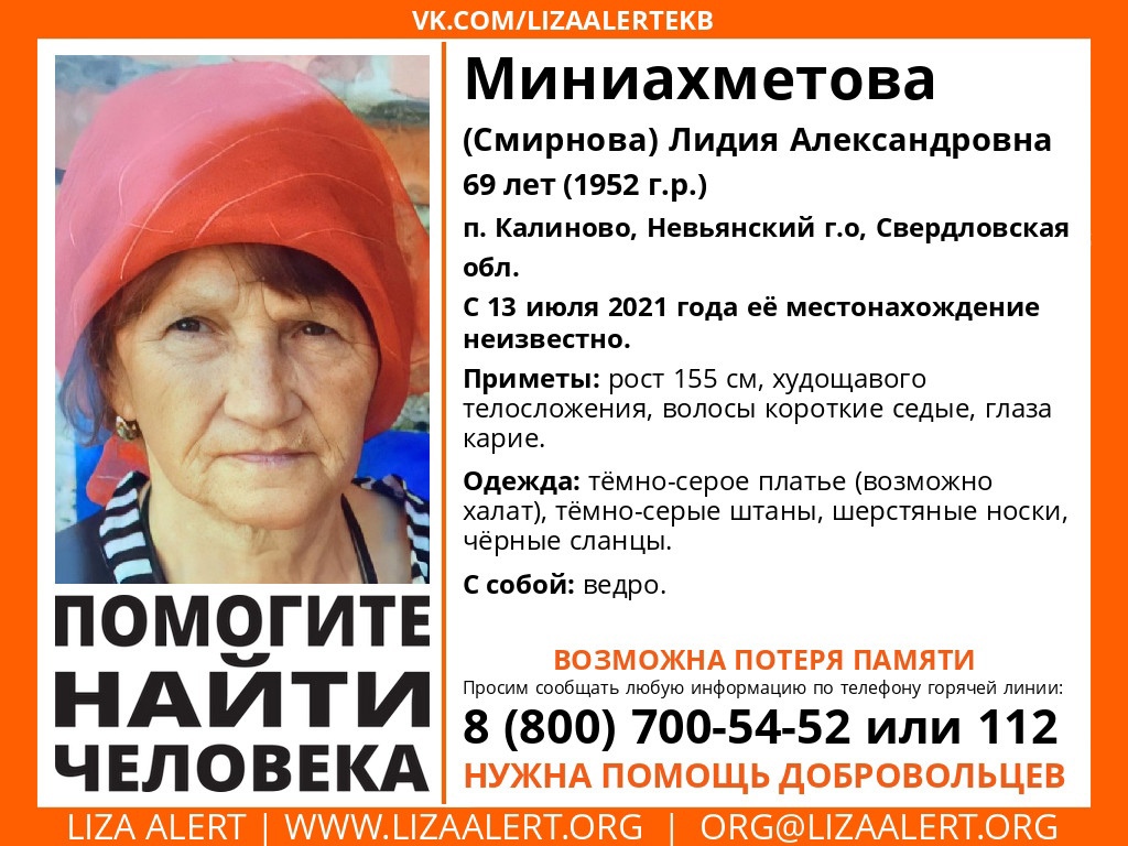Родственники, полиция и поисковые отряды ищут в поселке Калиново Невьянского городского округа ищут 69-летнюю Лидию Миниахметову – она собиралась за ягодами, вышла из дома 13 июля и пропала. Точной информации ушла ли бабушка в лес, нет.