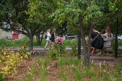 Ко Дню строителя в центре Екатеринбурга высадили деревья и установили брусья. Губернатор уже подтянулся