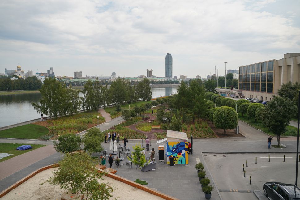 На набережной городского пруда в Екатеринбурга возле БЦ «Президент» высадили аллею из 14 яблонь и установили спортивные снаряды. Помимо деревьев в саду трав высадили декоративные кустарники и около сотни видов растений. Таким образом город готовится отметить День строителя, масштабное празднование которого, не состоится из-за пандемии.