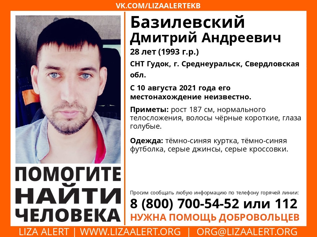 28-летний Дмитрий Базилевский пропал в садовом товариществе «Гудок» 10 августа. Родственники сообщили, что у него частичная потеря памяти. Возле Серовского тракта его ищут полиция и волонтеры поискового отряда «Лиза Алерт».