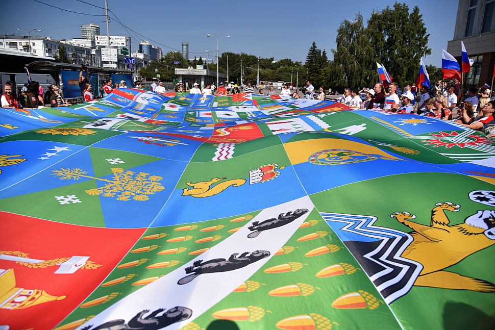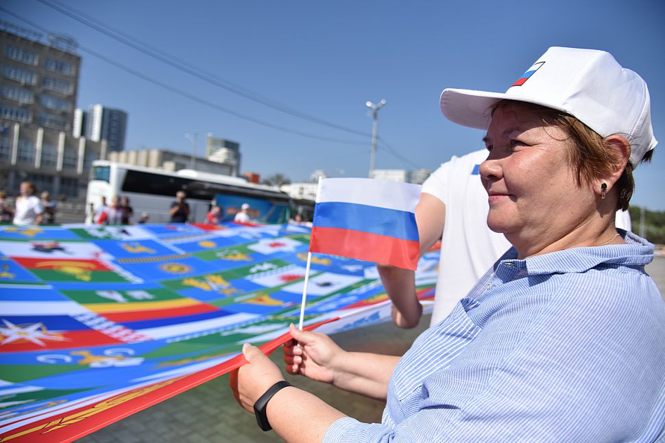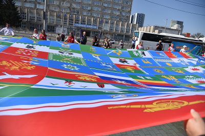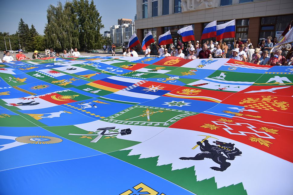 Здесь же были развёрнуты полотнища с флагами муниципальных образований Свердловской области.