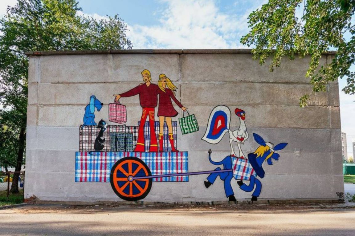 В Екатеринбурге рядом с «Таганским рядом» на улице Пехотинцев 10а художник Слава Птрк изобразил героев мультфильма «Бременские музыканты» с клетчатыми сумками челноков.