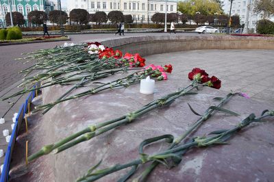 Екатеринбуржцы несут цветы к мемориалу жертвам стрельбы в пермском вузе