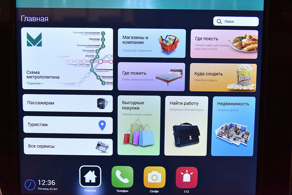 Любой пассажир может оперативно получить справочную информацию по магазинам, кафе и гостиницам, вывести на экран транспортную схему Екатеринбурга и сведения о метрополитене. Также есть выход в интернет и возможность бесплатного звонка.