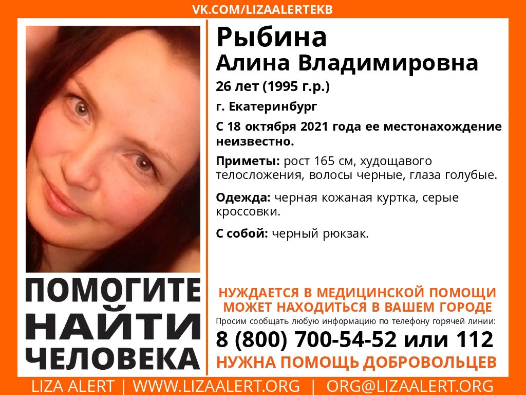 В Екатеринбурге волонтеры поискового отряда «Лиза Алерт» ищут 26-летнюю Алину Рыбину. Она пропала после ухода из больницы.