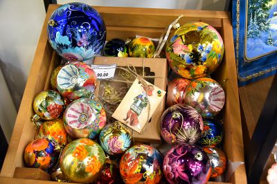 Так, на ярмарке можно найти елочные шары, расписанные знаменитыми мастерами тагильской лаковой росписи.