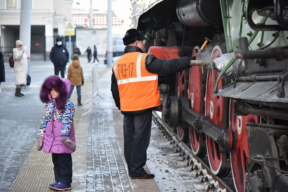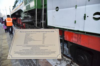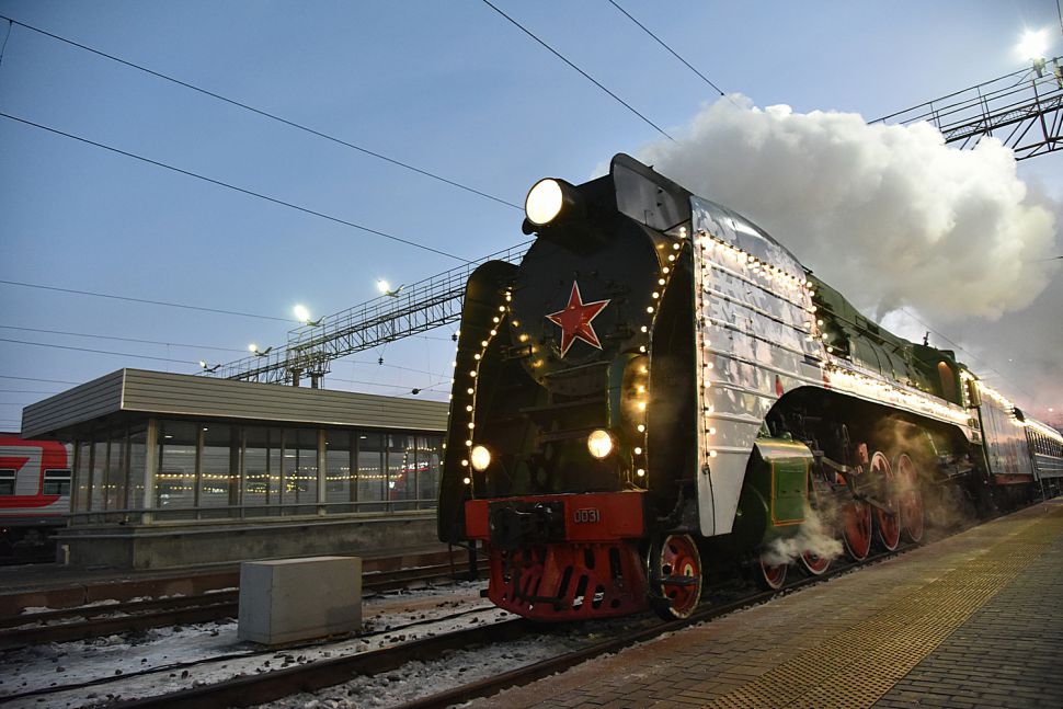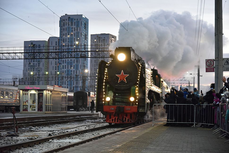 В столицу Урала праздничный состав доставил украшенный новогодними огнями ретро-паровоз – локомотив серии П36, который за лампасы на боках называют «генералом».
