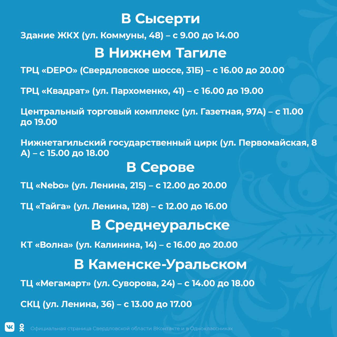 До 18:00 пункты открыты в ТРЦ «Гринвич» на ул. 8 Марта, 46; ТРК «Парк Хаус» на ул. Сулимова, 50; ТЦ «МЕГА» на ул. Металлургов, 87 (с 12:00); ТЦ «ОМЕГА» на пр. Космонавтов, 41 (с 12:00); ТЦ «Дирижабль» на ул. Академика Шварца, 17 (с 12:00); Екатеринбургском цирке на ул. 8 Марта, 43 (с 13:00) и ТРЦ VEER Mall на пр. Космонавтов, 108д (с 14:00).