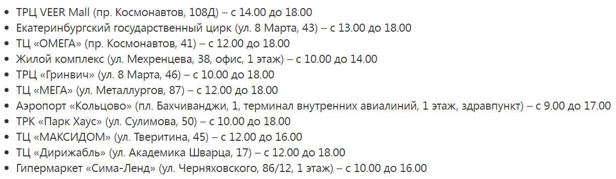 В Каменске-Уральском – СКЦ на ул. Ленина, 36 с 13:00 до 17:00 и ТЦ «Мегамарт» на ул. Суворова, 24 с 14:00 до 18:00.
