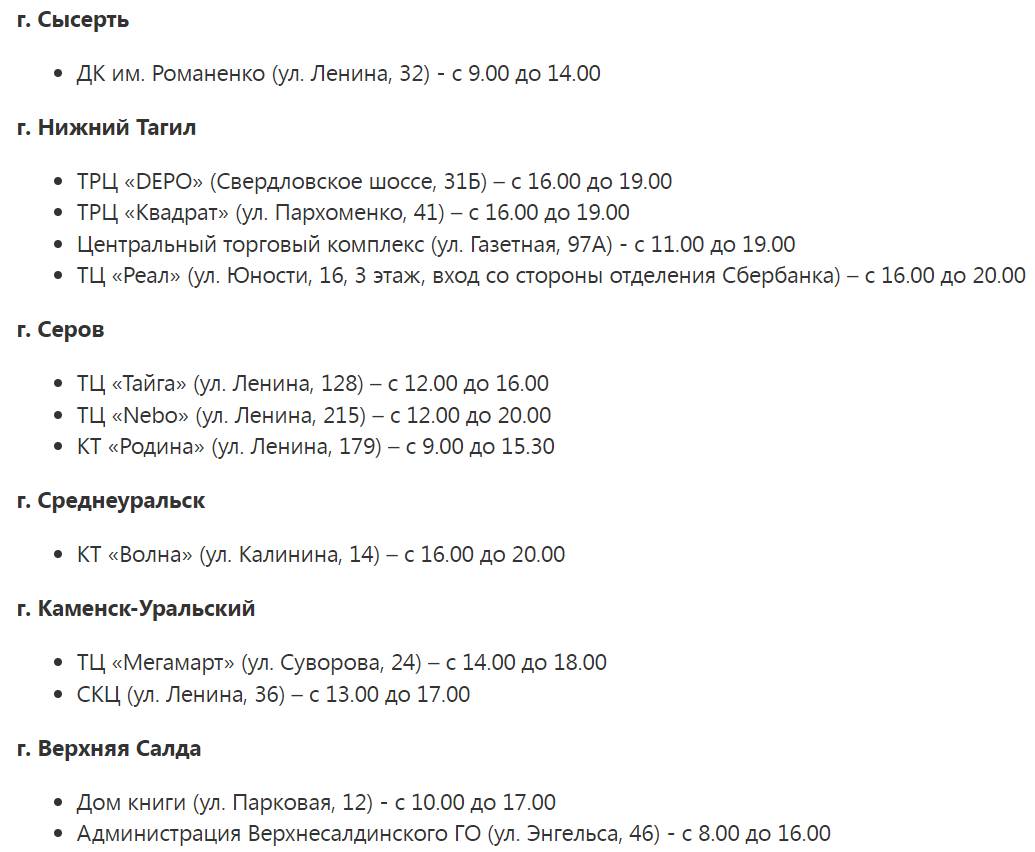 До 18:00 работает мобильный пункт в ТРЦ «Гринвич» на ул. 8 Марта, 46; ТРК «Парк Хаус» на ул. Сулимова, 50; ТЦ «Омега» на пр. Космонавтов, 41 (с 12:00); ТЦ «Дирижабль» на ул. Академика Шварца, 17 (с 12:00); ТРК «Мега» на ул. Металлургов, 87 (с 12:00); ТРЦ VEER Mall на пр. Космонавтов, 108д (с 14:00) и цирке на ул. 8 Марта, 43 (с 13:00).