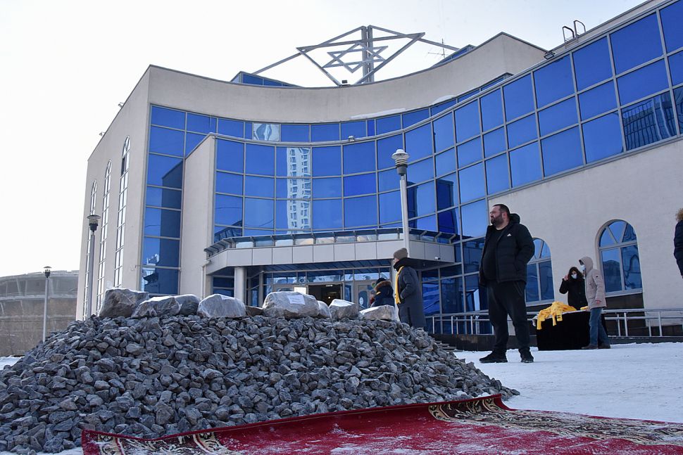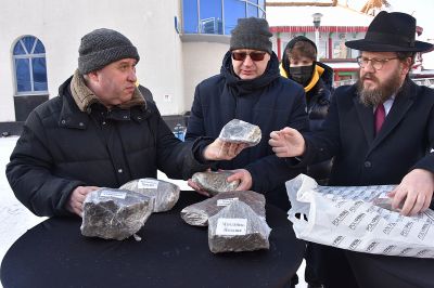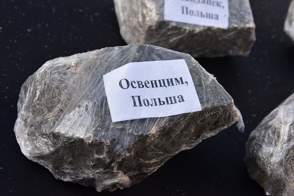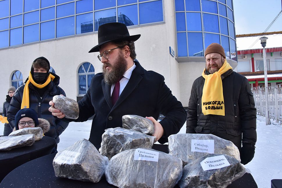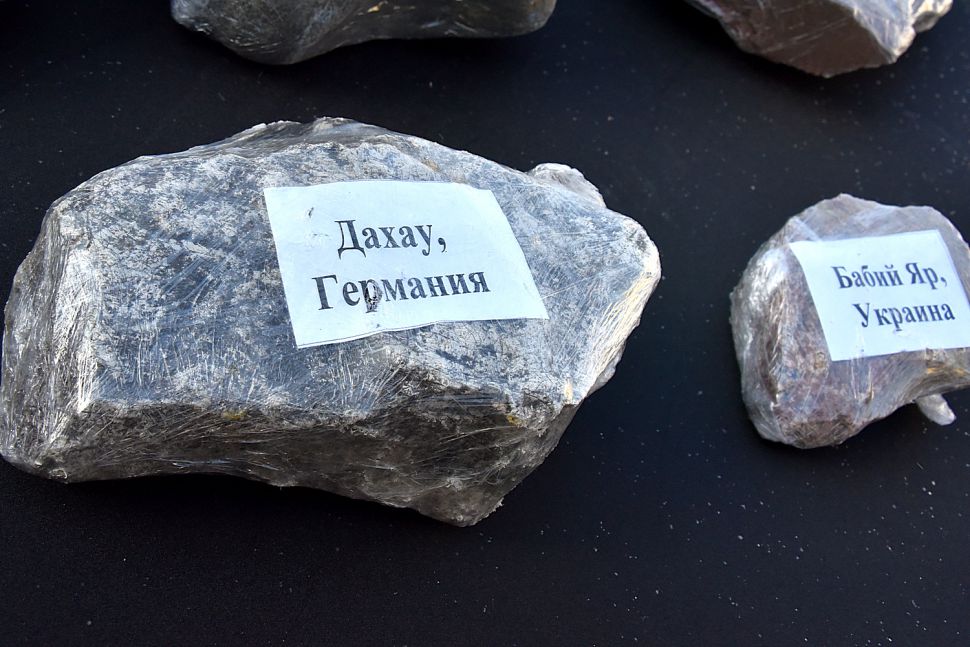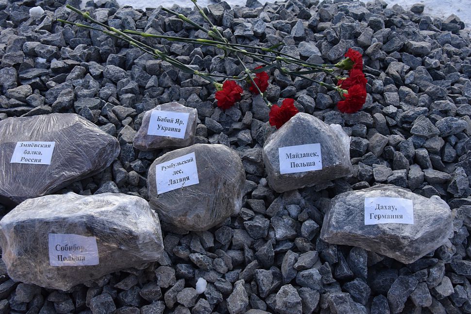 Сегодня перед Синагогой были заложены десять камней. Все они были специально собраны и привезены из бывших концлагерей и из мест гибели узников гетто: Освенцима, Треблинки, Собибора, Майданека, Бухенвальда, Дахау, Бабьего Яра, Румбульского леса, Ямы и Змиёвской балки. Камни станут в дальнейшем частью скульптурной композиции.