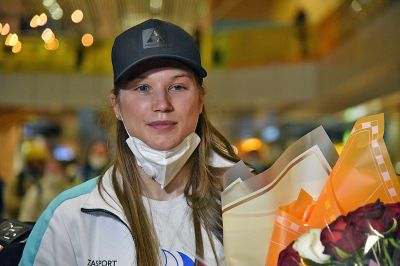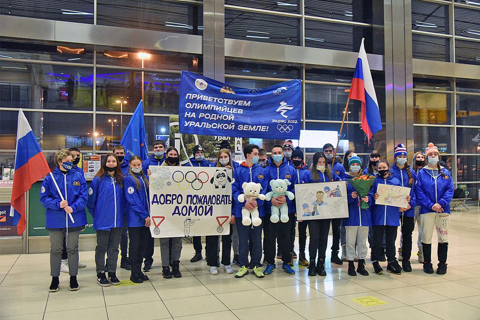 Биатлонисток встречали с цветами и оркестром. В аэропорт Кольцово приехали воспитанники Школы олимпийского резерва, а также министр физической культуры и спорта Леонид Рапопорт.