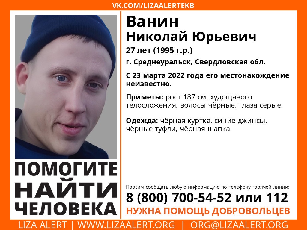 23 марта в Среднеуральске пропал 27-летний Николай Ванин, он вышел из дома и больше его никто не видел.