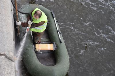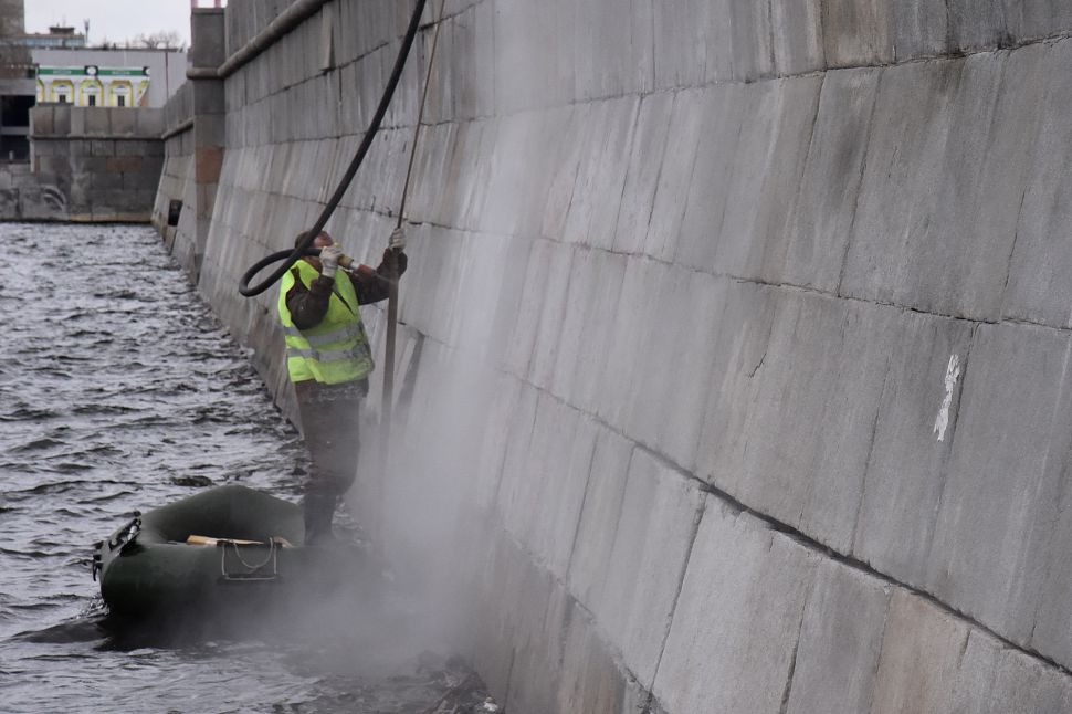 Что касается гранитных набережных городского пруда, то они очищаются с помощью пескоструйной машины. Иногда приходится использовать шлифовальные машинки и снимать несколько слоев гранита – настолько краска въедается в покрытие.