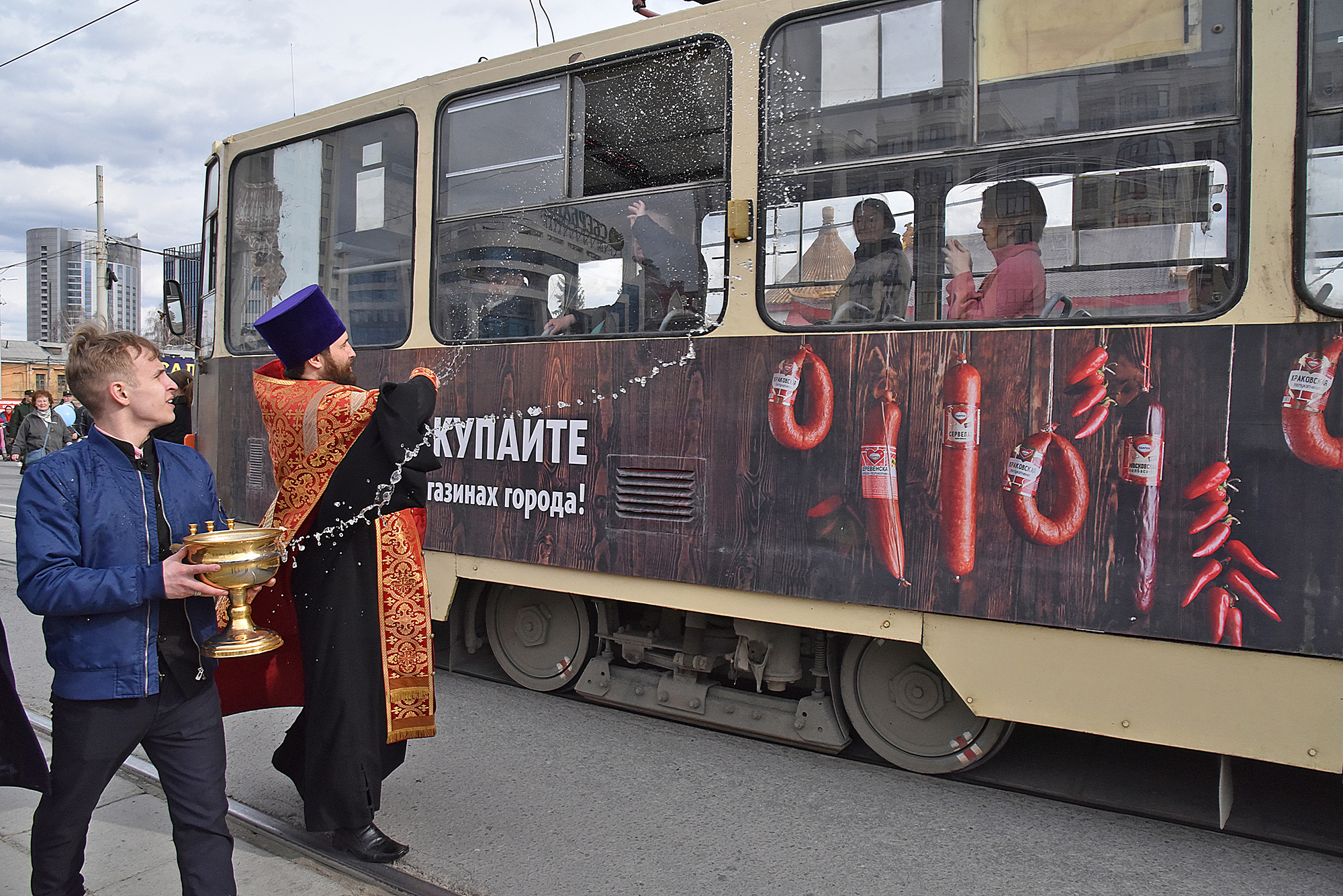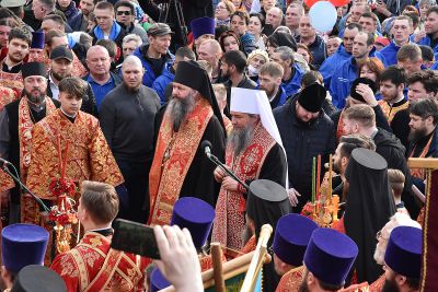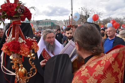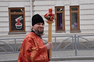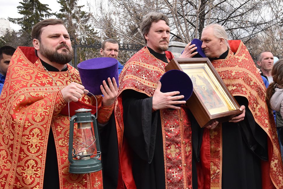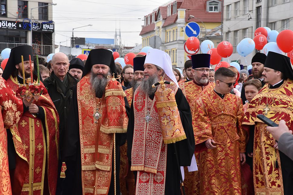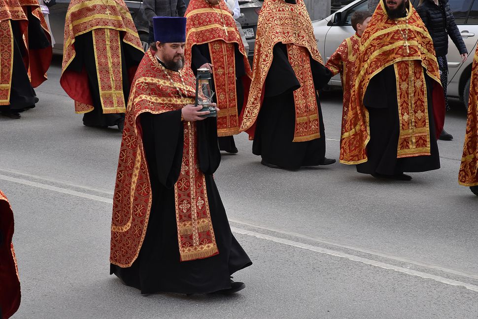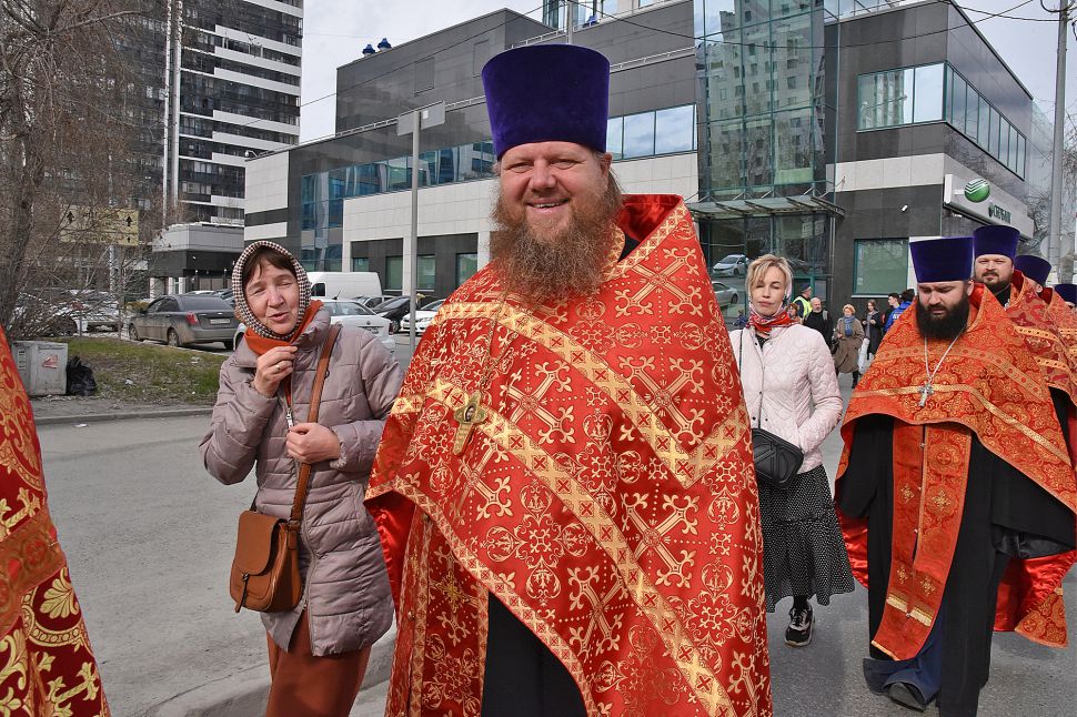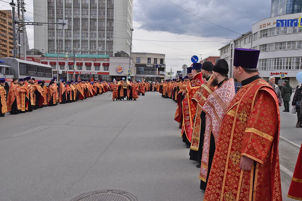 Прихожане прошли по улицам Екатеринбурга с хоругвями и иконами, священники несли ковчеги с частицами мощей православных святых: святой великомученицы Екатерины Александрийской, святого благоверного Александра Невского, святого праведного Симеона Верхотурского и другие святыни, а также Благодатный огонь из Иерусалима.