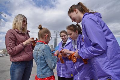 Сегодня раздача ленточек происходила в центре Екатеринбурга – на площади Труда. Волонтеры вышли на улицы и раздавали главный символ акции, а также рассказывали уральцам значение и правила использования Георгиевской ленточки.