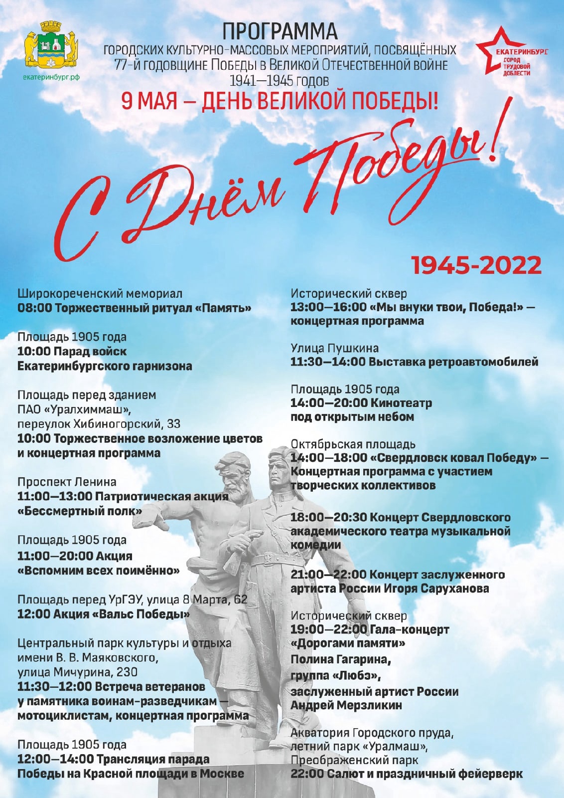 В Екатеринбурге отпразднуют День Победы. 9 мая праздничные мероприятия стартуют в 08:00.