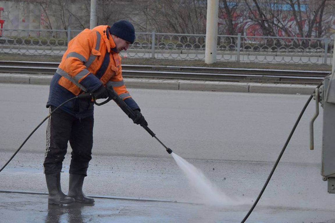 Коммунальщики прибирают улицы Екатеринбурга ко Дню Победы в круглосуточном режиме