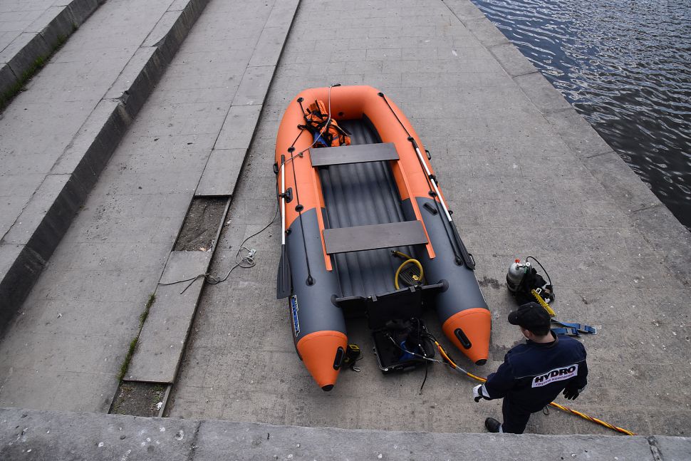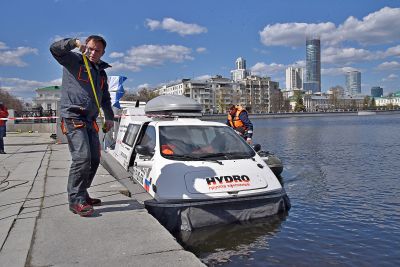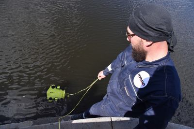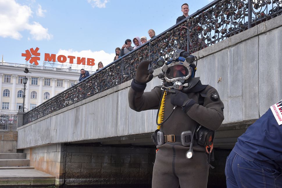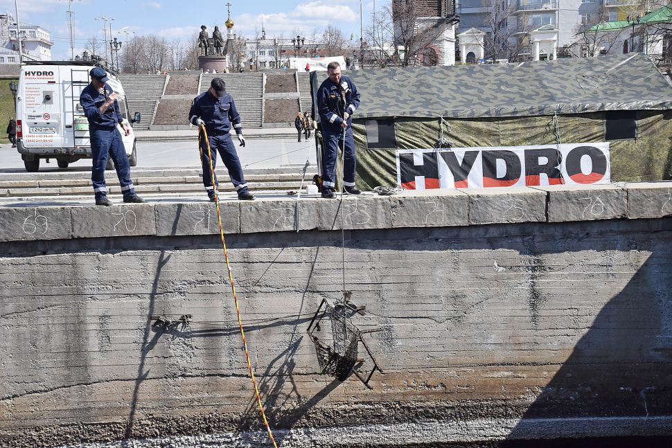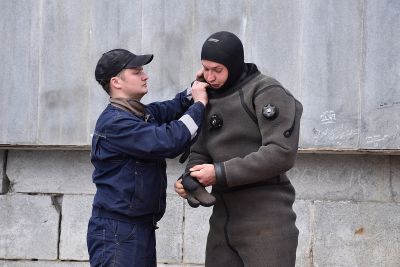 Водолаз специализированного предприятия «ГИДРО» несколько часов работал в мутной воды. Он даже вытащил со дна реки продуктовую тележку.