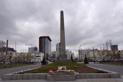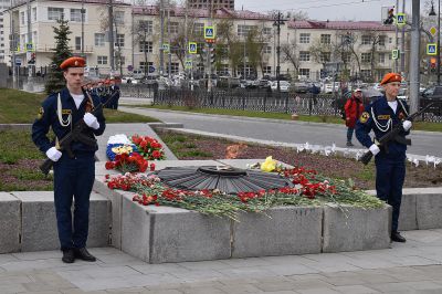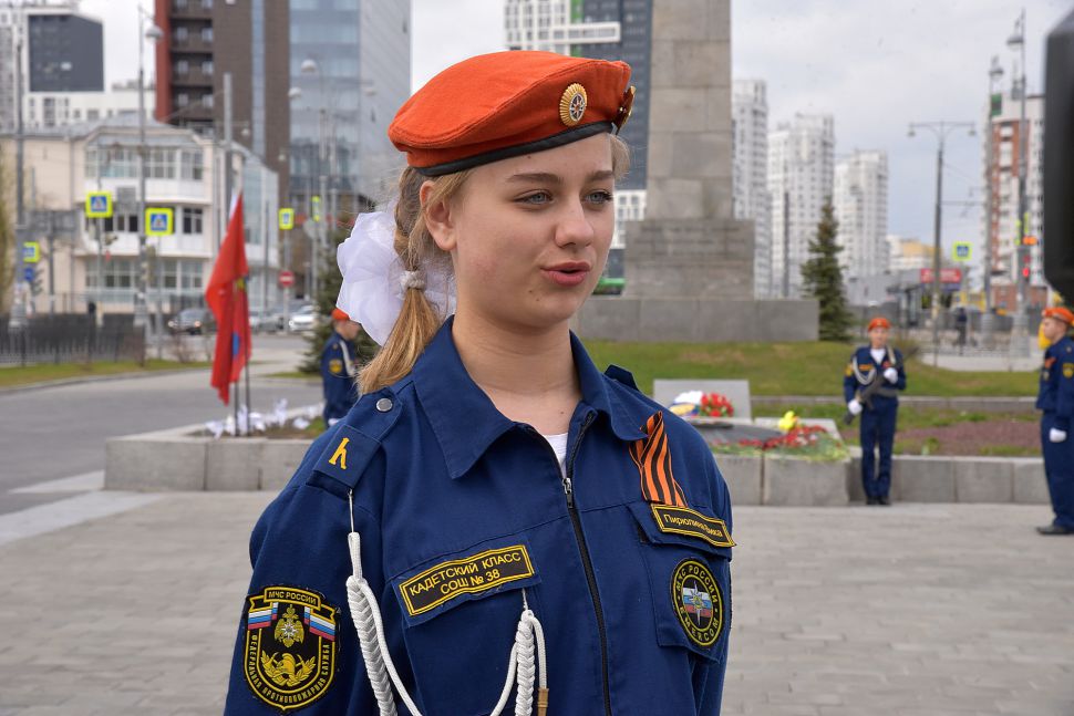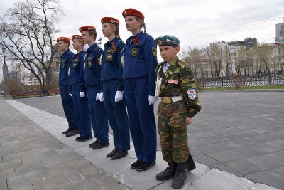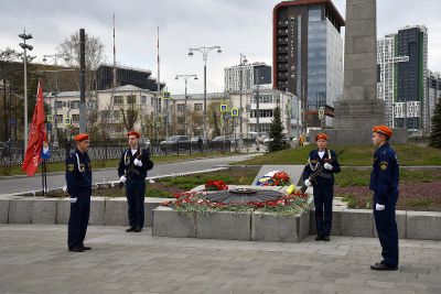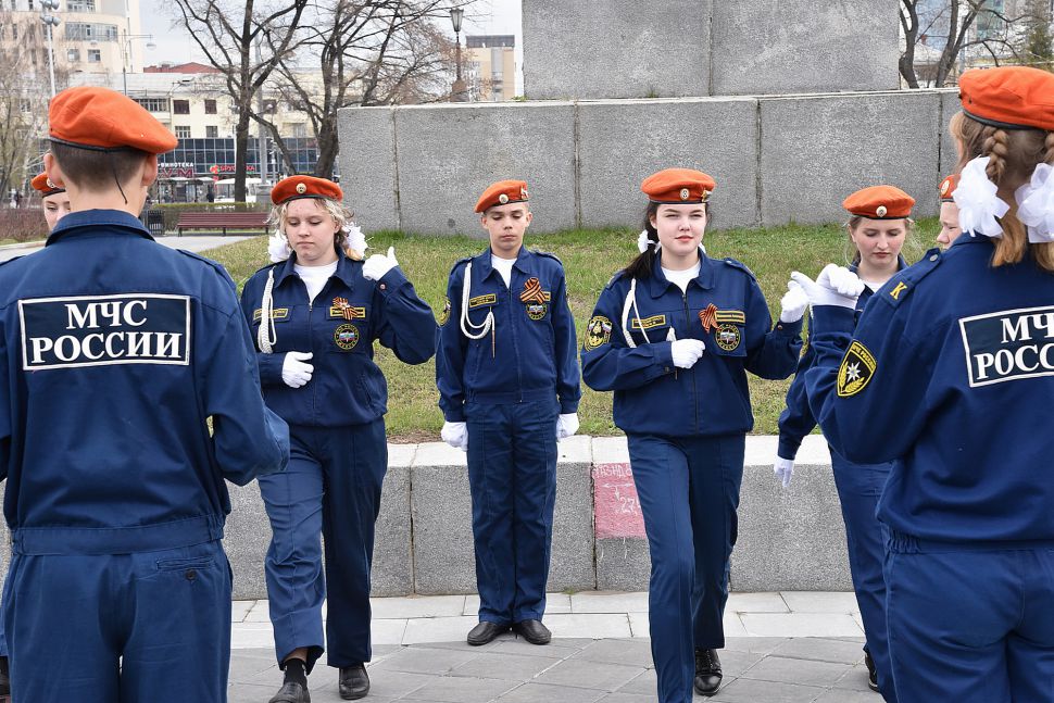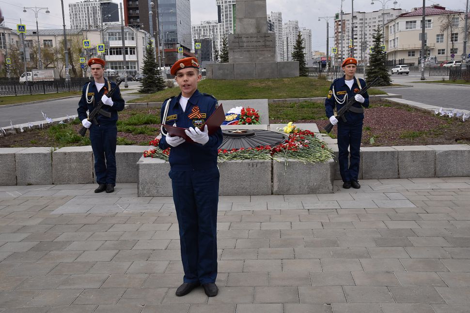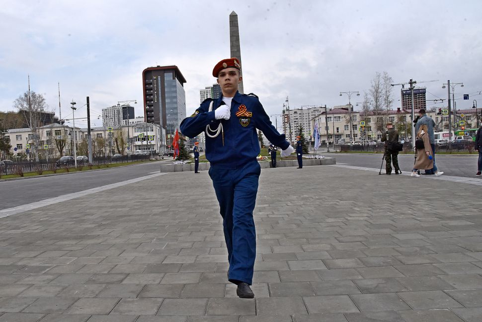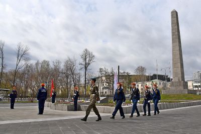 В рамках акции у мемориала «Вечный огонь» на площади Уральских Коммунаров в Екатеринбурге школьники приступили к несению почетного караула.