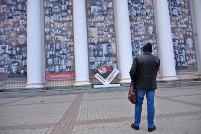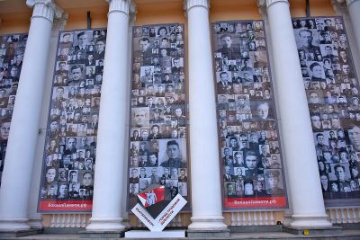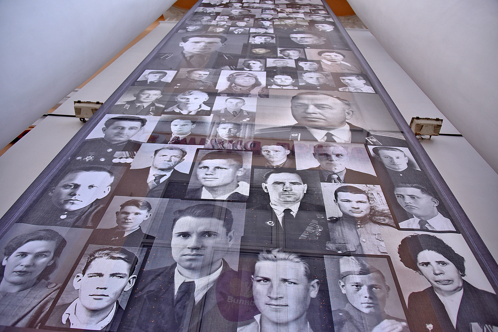850 фотографий уральцев, ушедших на фронт со свердловского вокзала, напечатали на 12 полотнищах, каждое высотой 10 метров.