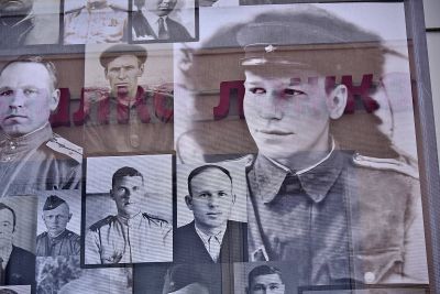 Коллективный портрет объединил и участников боев, и тружеников тыла, в том числе сотрудников Свердловской железной дороги. Черными рамками отмечены лица тех, кто не вернулся с фронта.