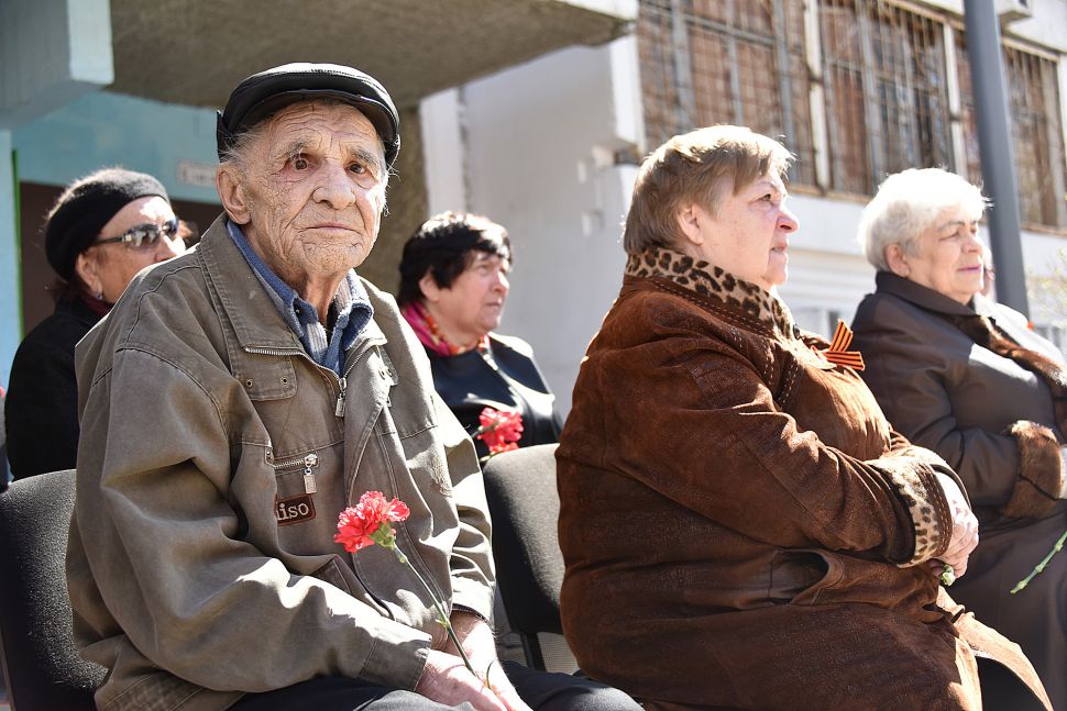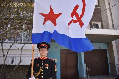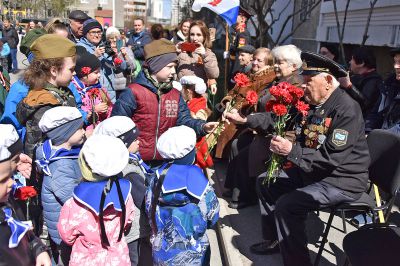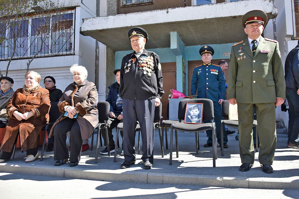Участники акции во дворе его дома вручили фронтовику цветы, поздравительный адрес и праздничный набор.