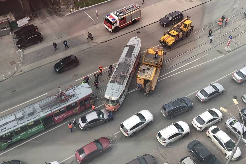 Утром в Екатеринбурге на улице Радищева в сторону Московской трамвай 33 маршрута сошел с рельсов и столкнулся с встречным вагоном 27 маршрута. В результате образовалась пробка в обе стороны.