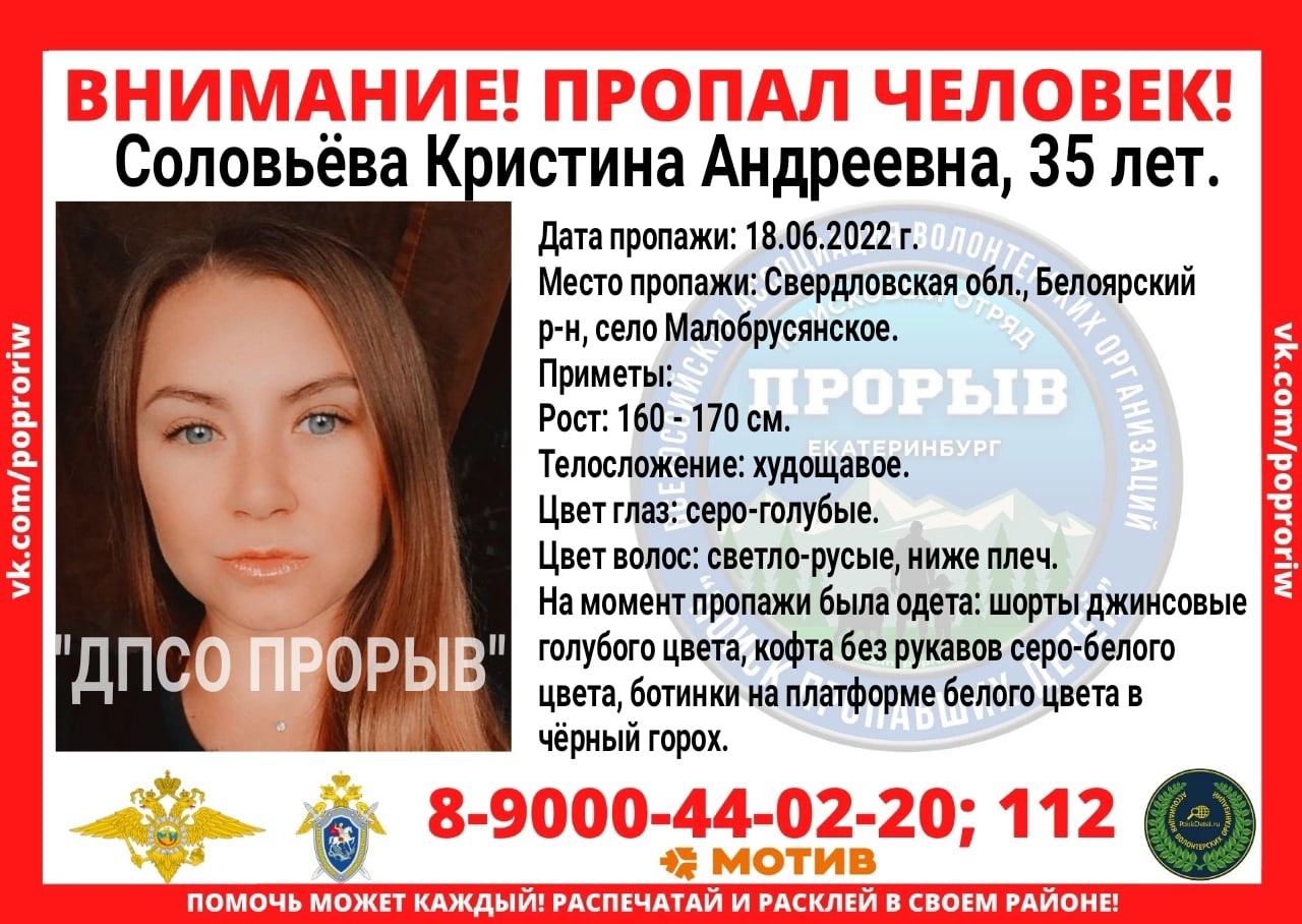 В селе Малобрусянском в Свердловской области пропала 35-летняя мать двоих детей Кристина Соловьева. 18 июня она приехала к маме в гости с двумя детьми, вышла в магазин и пропала. Телефон женщины выключен.