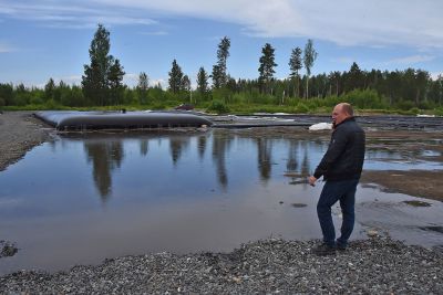 На площадке разложены геотубы — специальные мешки для сбора донных отложений. Ил остается в геотубах, а чистая вода выходит и поступает в водоотводные канавы. Оттуда вода попадает в отстойник, а затем вытекает в реку Черная.