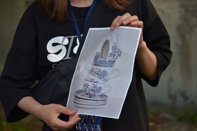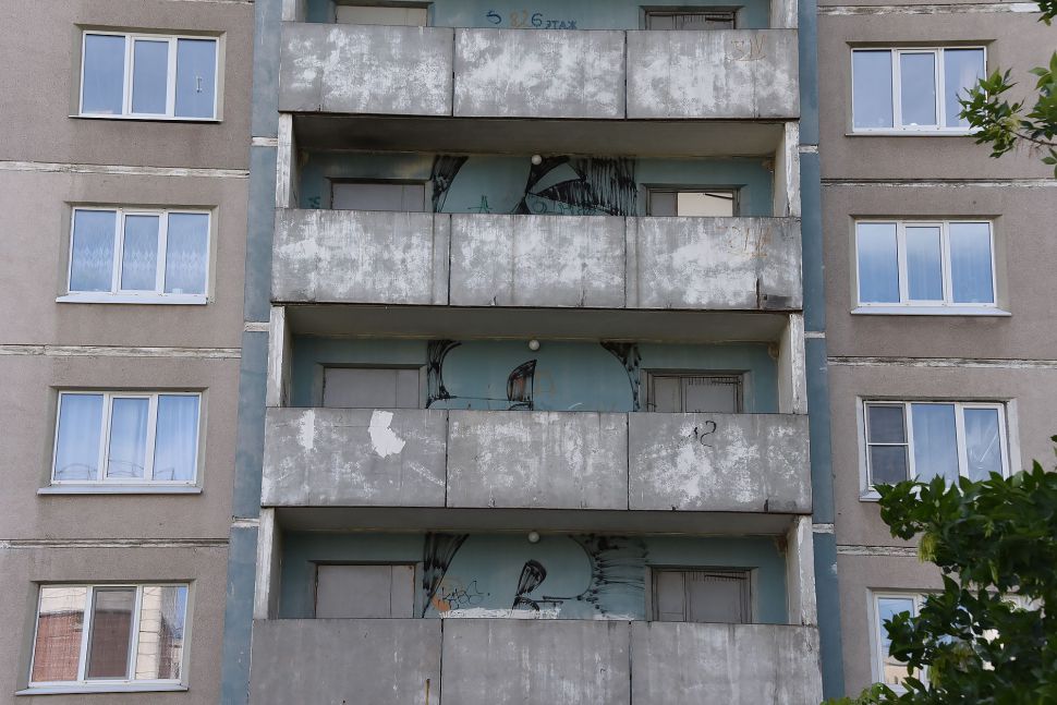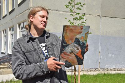 Художник их Казахстана Станислав Алерт готовиться нарисовать свою композицию на стене жилого дома № 29 на Сибирском тракте. Здесь будет изображена кухонная посуда – тарелки, блюдца, кружки.