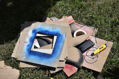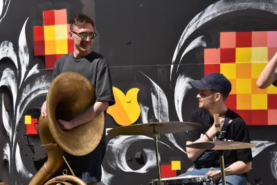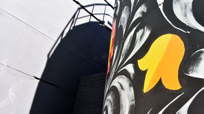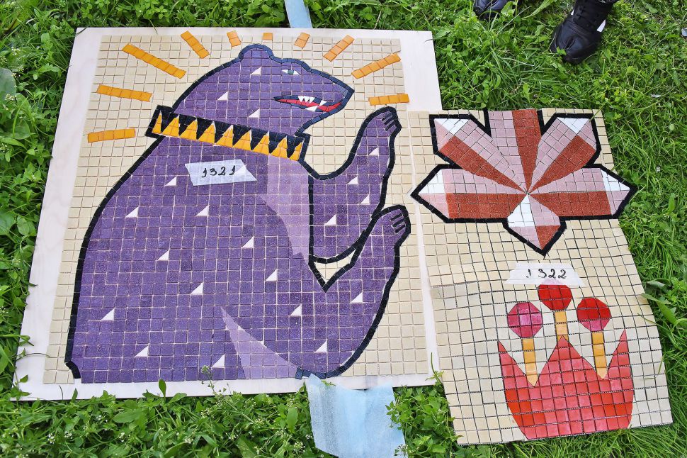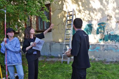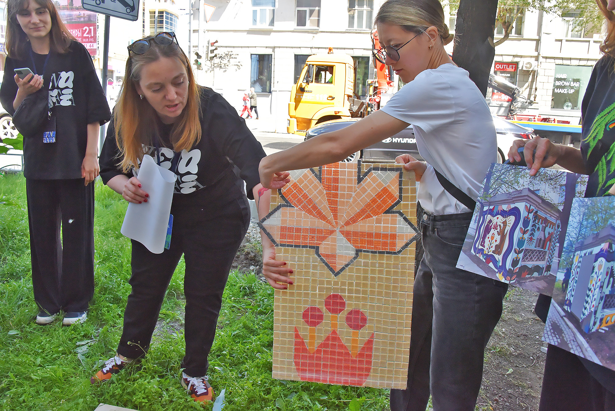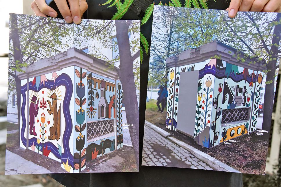 Третьим пунктом пресс-тура стала вентиляционная будка на улице Белинского, 2, где команда из Москвы во главе со Светланой Растебиной готовят поверхность для размещения очень необычного произведения – в качестве сюжета использован герб уральской столицы: медведь и соболь. Композиция будет выполнена в форме мозаики. Это первый опыт за 13 лет существования фестиваля.
