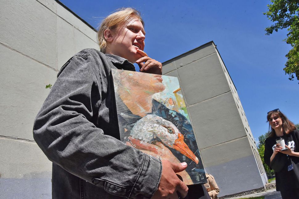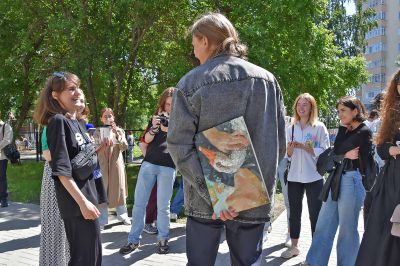 Следующей точкой пресс-тура стал лицей № 173 (улица Народной воли, 21), на фасаде которого петербургский художник Кирилл Бородин в ближайшие дни приступит к созданию полотна, повторяющего его же живописную работу «Автопортрет с гусем».