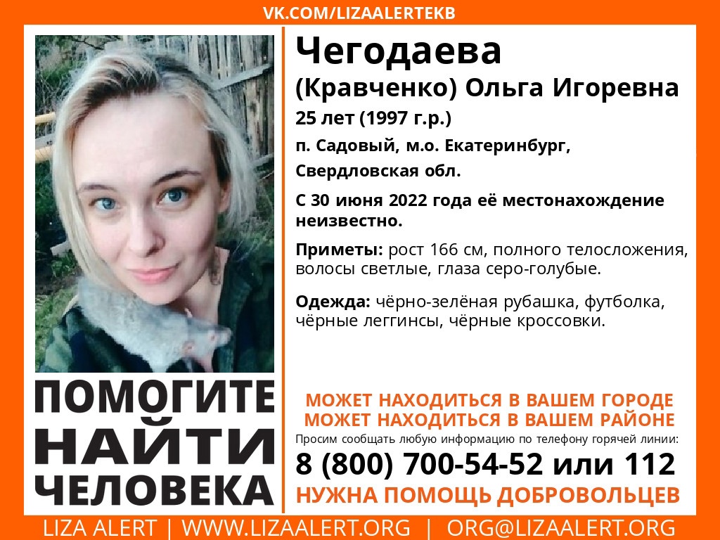 В поселке Садовом под Екатеринбургом неделю назад пропала 25-летняя Ольга Чегодаева. 30 июня она вышла из дома и больше ее никто не видел. Девушка перестала выходить на связь.