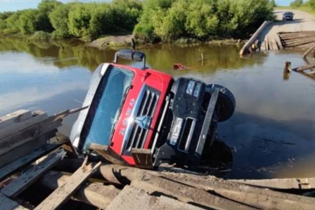 Под грузовым автомобилем развалился мост.