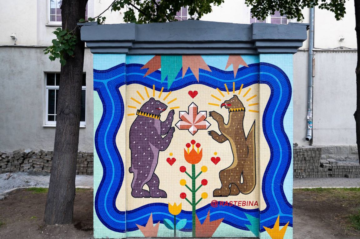 В Екатеринбурге продолжается фестиваль Stenograffia. Еще одна работа была создана в уральской столице, называется она «Медведь и соболь». На вентиляционной будке на улице Белинского, 2 в Екатеринбурге московская художница Светлана Растебина сделала панно из мозаики в виде герба уральской столицы.