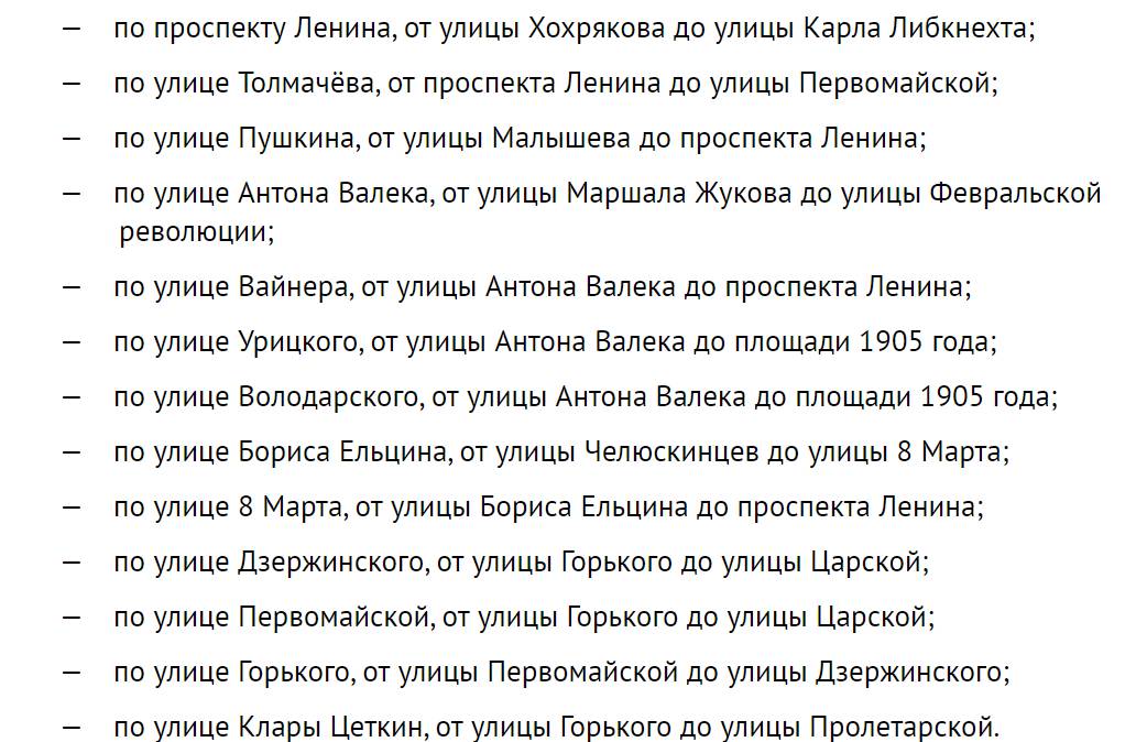 С 22:00 19 августа с 22:00 до момента окончания мероприятий власти закроют движение по улице 8 Марта от Малышева до проспекта Ленина и по улице Пролетарской от Дзержинского до Первомайской.