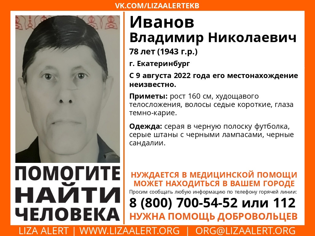 9 августа в Екатеринбурге пропал 78-летний Владимир Иванов. Мужчина ушел на прогулку и не вернулся.