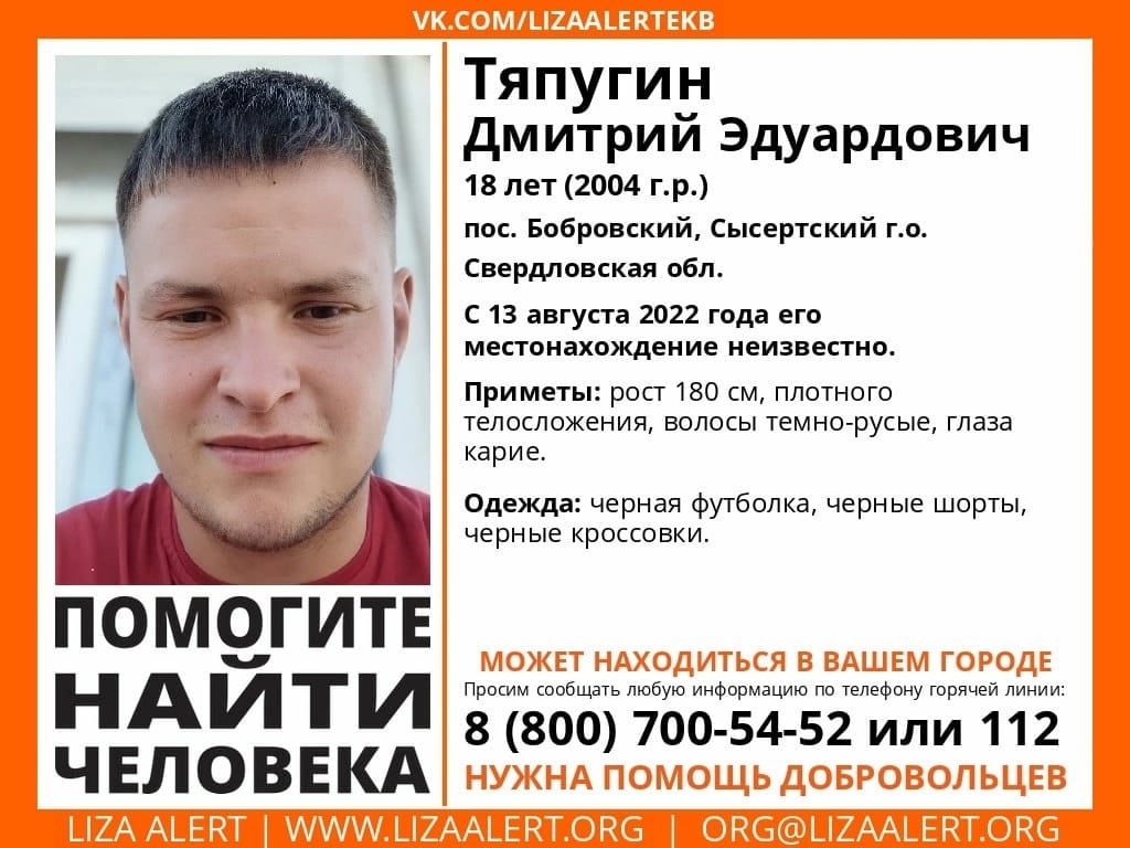 18-летний Дмитрий Тяпугин пропал 13 августа в поселке Бобровском под Екатеринбургом. Он ушел из дома и не вернулся.