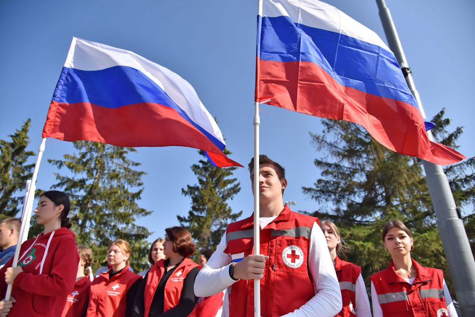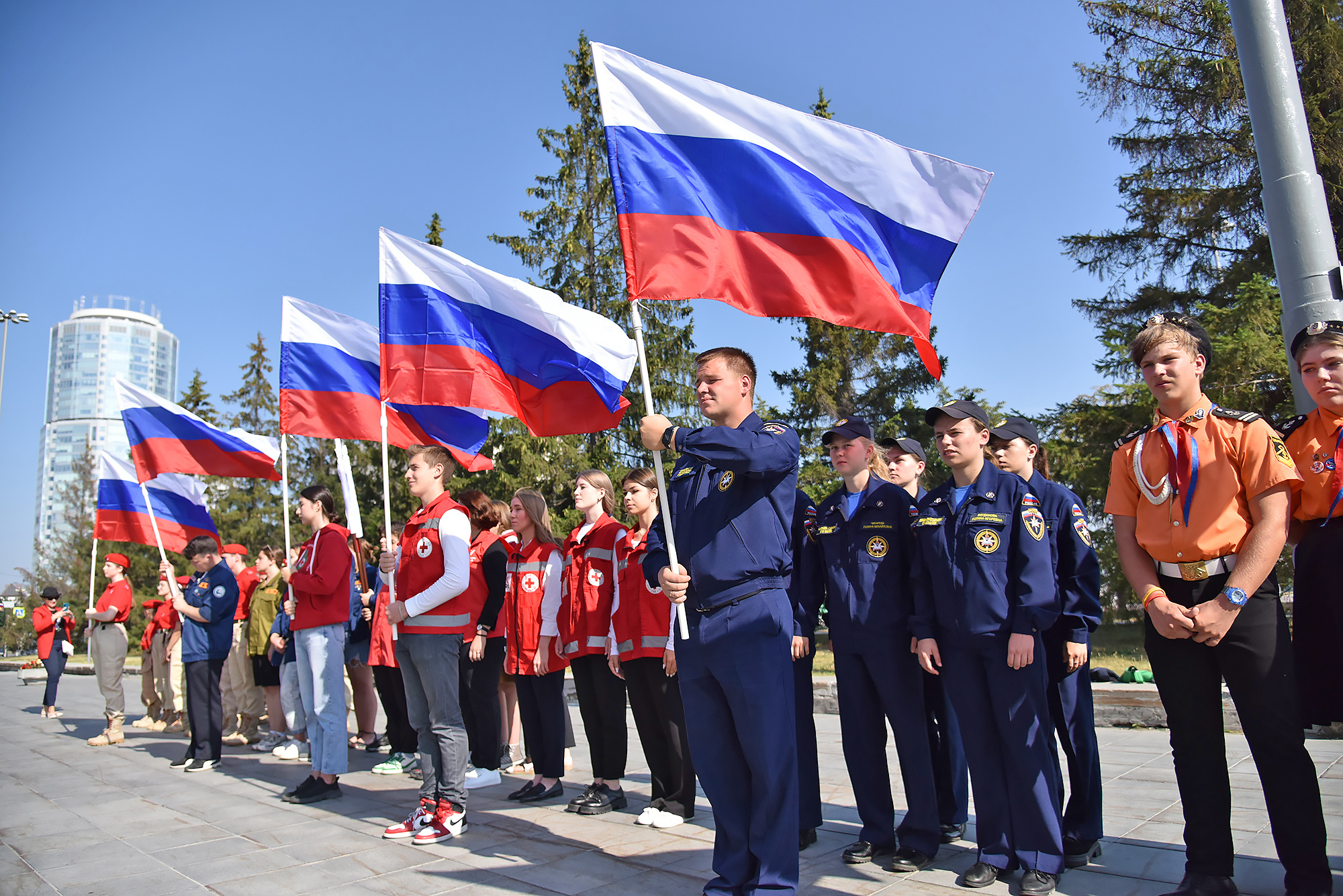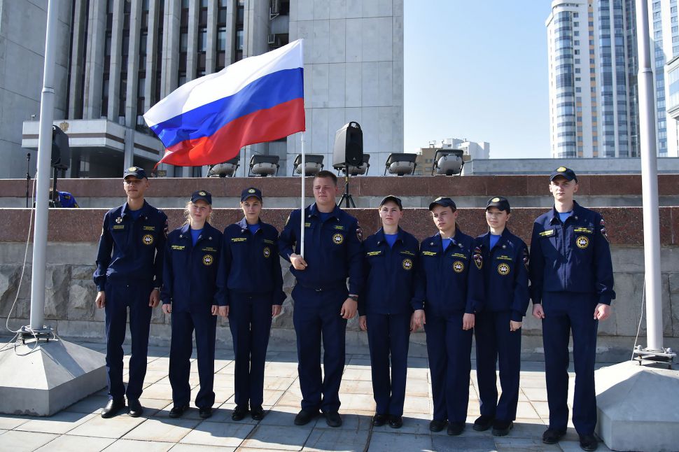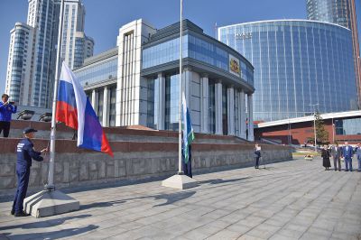 В День государственного флага Российской Федерации у свердловского «белого дома» прошла церемония поднятия национального триколора. Вместе с волонтерами и общественниками сюда пришли председатель Законодательного собрания Людмила Бабушкина, председатель комитета Госдумы по государственному строительству и законодательству Павел Крашенинников, руководитель Дома добровольцев региона Евгений Дайнес и директор Свердловского областного медицинского колледжа Ирина Левина.