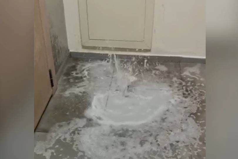 В Екатеринбурге после сильного дождя в ЖК «Ботанический сад» произошла коммунальная авария. Прямо из под пола в подъезде забил фонтан.