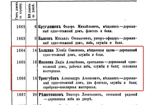 На месте, где были найдены аптекарские бутылочки, в начале XX века располагались жилые дома. Подняв документы, выяснилось, что на Третьей Мельковской улице Мельковской Слободы жилии мещанская вдова Холкина Ксиония Семеновна, крестьянка Иванова Лидия Алексеевна, мещанин и владелец ювелирной мастерской Троегубов Александр Ассонович.
