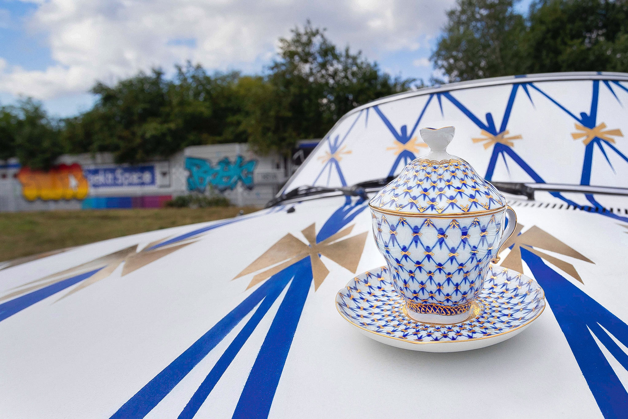 По словам художников, они выбрали в качестве орнамента кобальтовую сетку, так как она позволяла из-за своей «жесткой геометрии сломать объем машины». С одного из боков узор «не выдерживает напряжения» и рвется.
