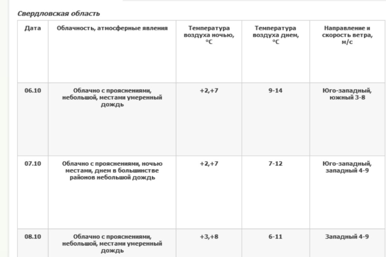 «В воскресенье и в первой половине следующей недели осадков немного, вероятны они в основном в северных районах Свердловской области и Пермском крае. Температура заметно понизится с 9 по 12 октября ночью +2,+7 градусов, днем +8,+13 градусов», —сообщила главный синоптик региона Галина Шепоренко.